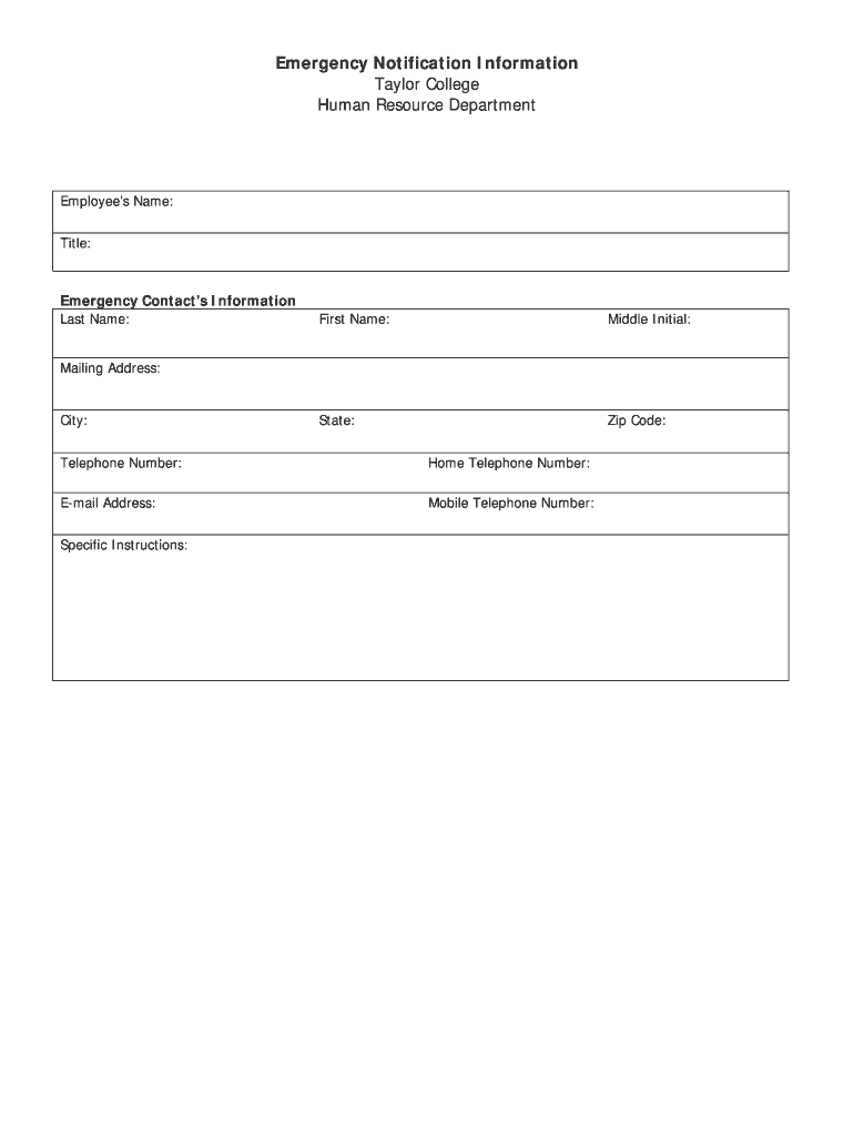 Emergency Notification Information Taylor College Human Resource Department Employees Name: Title: Emergency Contacts Information Last Name: First Name: Middle Initial: State: Zip Code: Mailing Address: