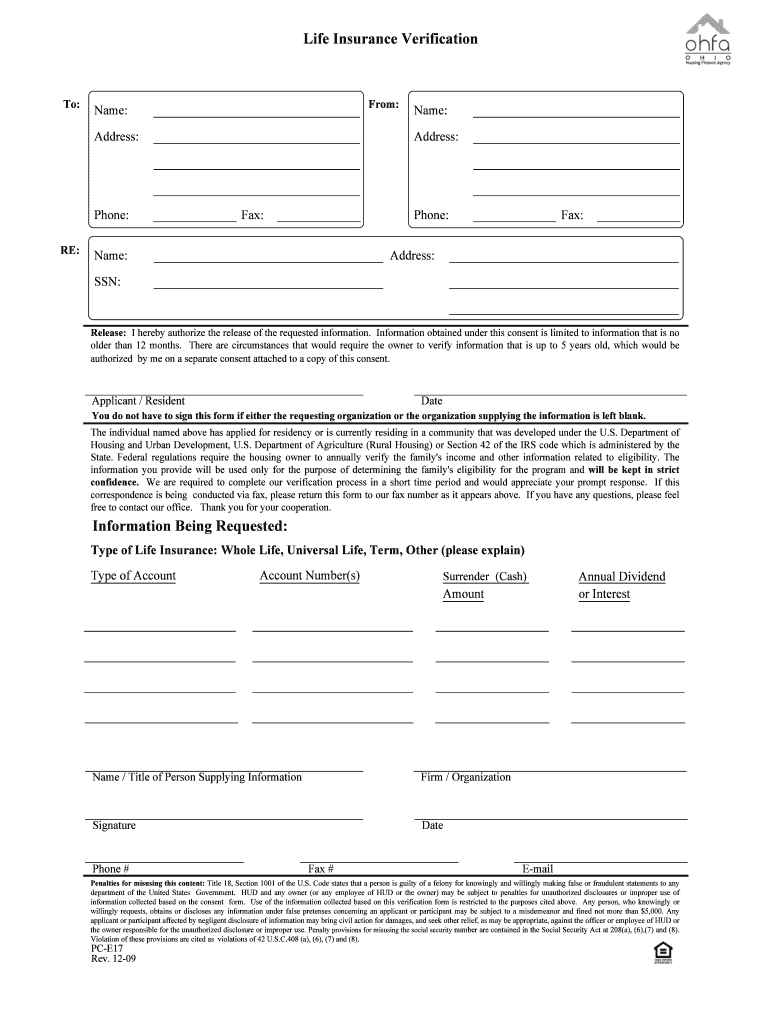 The Life Insurance Verification Form is a personal finance document used by individuals residing in housing programs to authorize the release of life insurance information for eligibility verification.