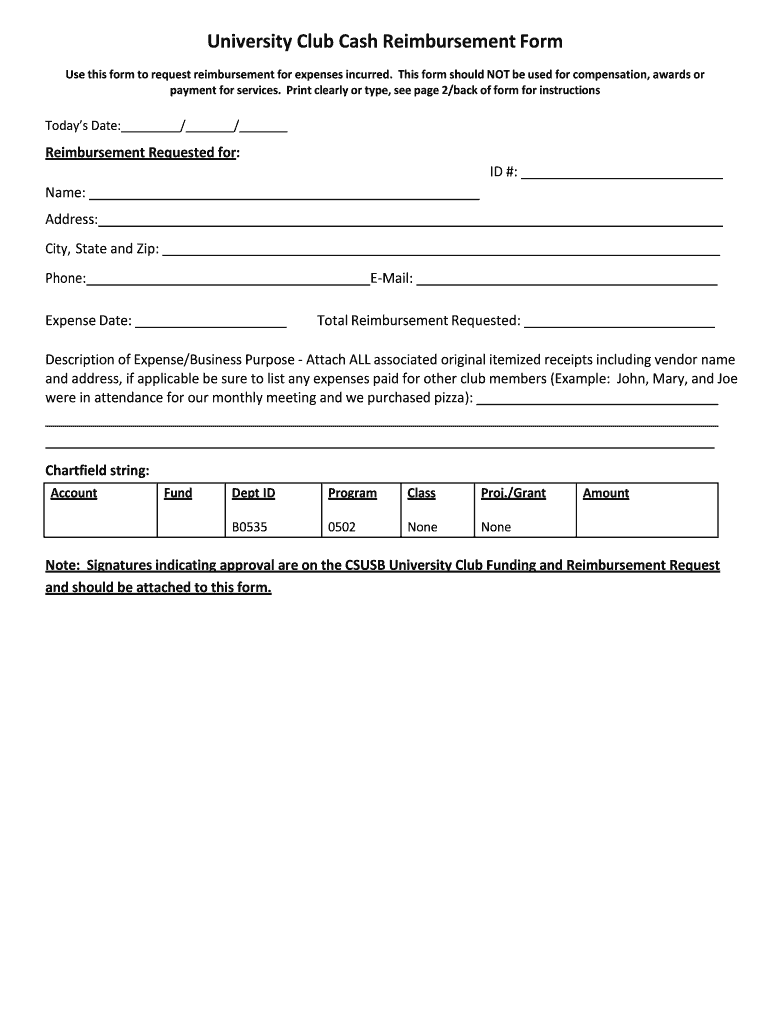 University Club Cash Reimbursement Form Use this form to request reimbursement for expenses incurred. This form should NOT be used for compensation, awards or payment for services. Print clearly or