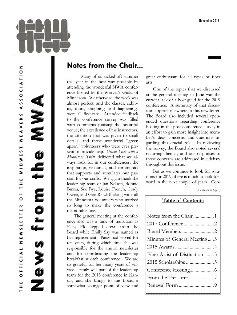 Notes from the Chair... News from the MWA THE OFFICIAL NEWSLETTER OF THE MIDWEST WEAVERS ASSOCIATION November 2015 Many of us kicked off summer this year in the best way possible by attending the