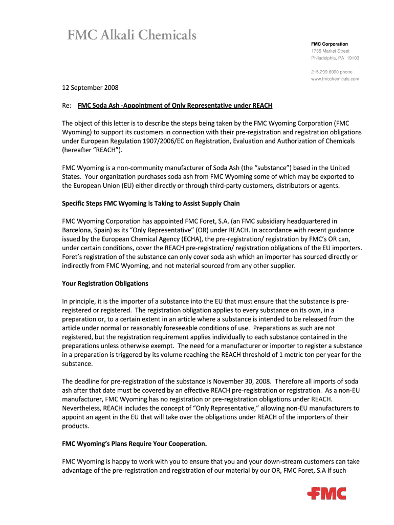 FMC Corporation 1735 Market Street Philadelphia, PA 19103 215.299.6000 phone www.fmcchemicals.com 12 September 2008 Re: FMC Soda Ash Appointment of Only Representative under REACH The object of this