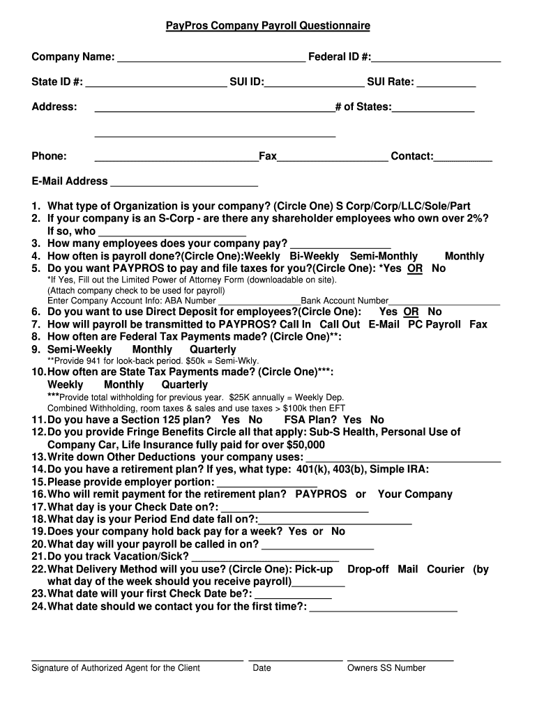 This questionnaire is intended for businesses seeking to establish or update their payroll processes. Specifically, companies with new hires or those undergoing changes in payroll operations will find the questionnaire indispensable. Furthermore, the presence of authorized agents, responsible for signing the document, is crucial to ensure that all provided information is officially validated.