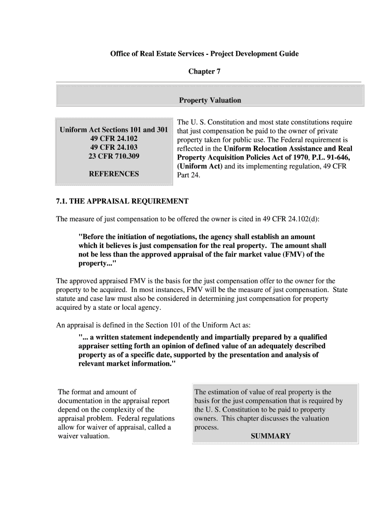 Office of Real Estate Services Project Development Guide Chapter 7 Property Valuation Uniform Act Sections 101 and 301 49 CFR 24.102 49 CFR 24.103 23 CFR 710.309 REFERENCES The U. S. Constitution