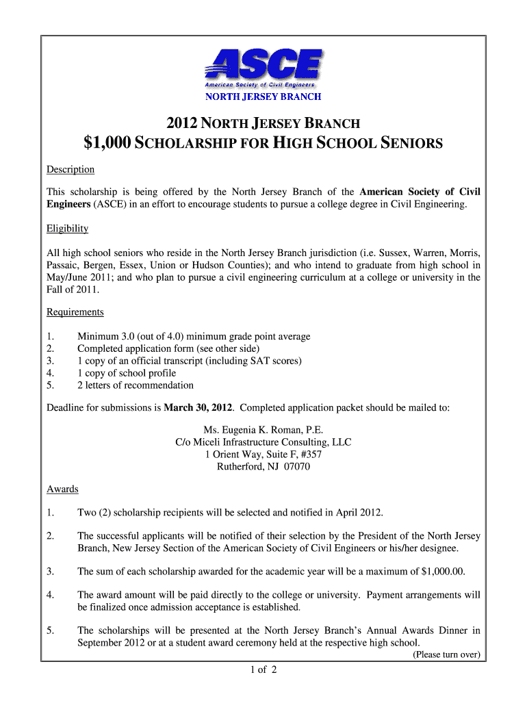 NORTH JERSEY BRANCH 2012 NORTH JERSEY BRANCH $1,000 SCHOLARSHIP FOR HIGH SCHOOL SENIORS Description This scholarship is being offered by the North Jersey Branch of the American Society of Civil Engineers