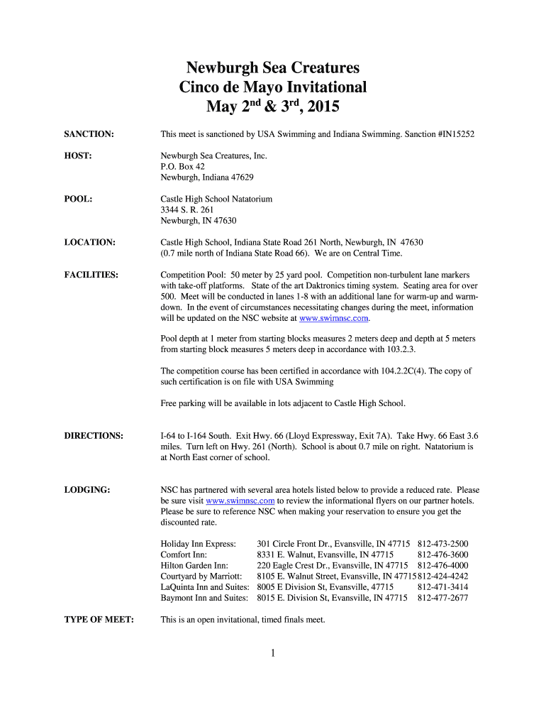 Newburgh Sea Creatures Cinco de Mayo Invitational May 2nd & 3rd, 2015 SANCTION: This meet is sanctioned by USA Swimming and Indiana Swimming. Sanction #IN15252 HOST: Newburgh Sea Creatures, Inc. P.O.