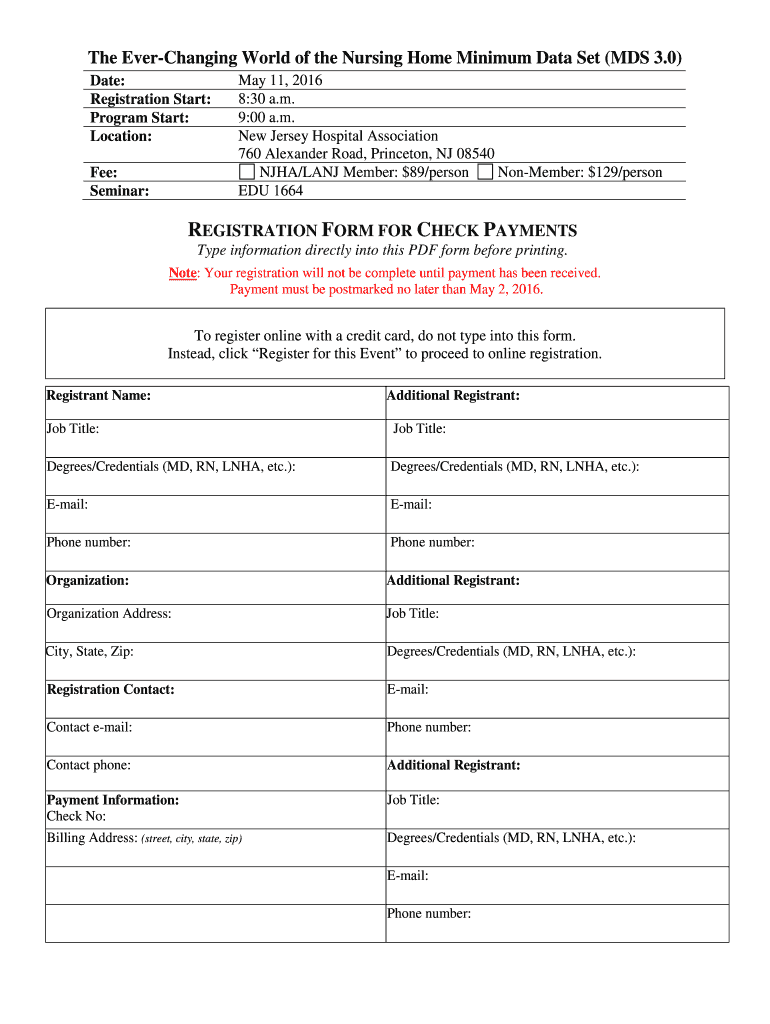 The Ever-changing World of the Nursing Home Minimum Data Set (MDS 3.0) May 11, 2016, Registration: 8:30 a.m. Program: 9 a.m. 12:30 p.m. Seminar: EDU 1664 Location: Fee: 760 Alexander Road, Princeton,