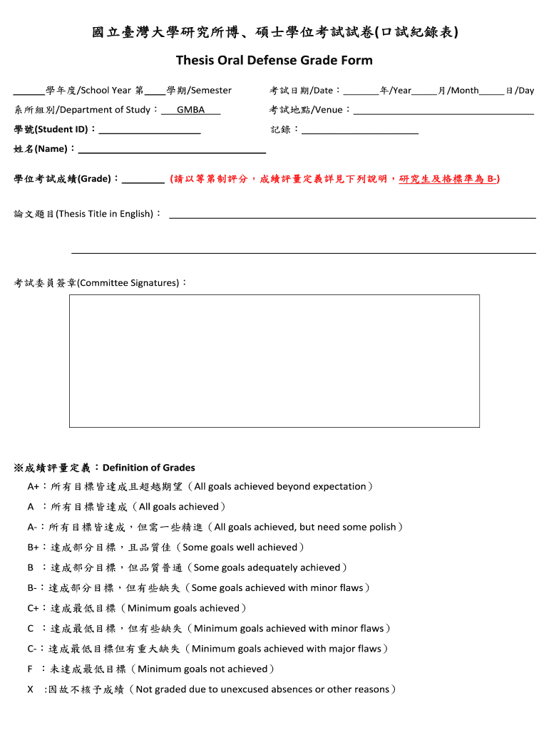 Get the free (?????) Thesis Oral Defense Grade Form - ?????????? - exp management ntu edu