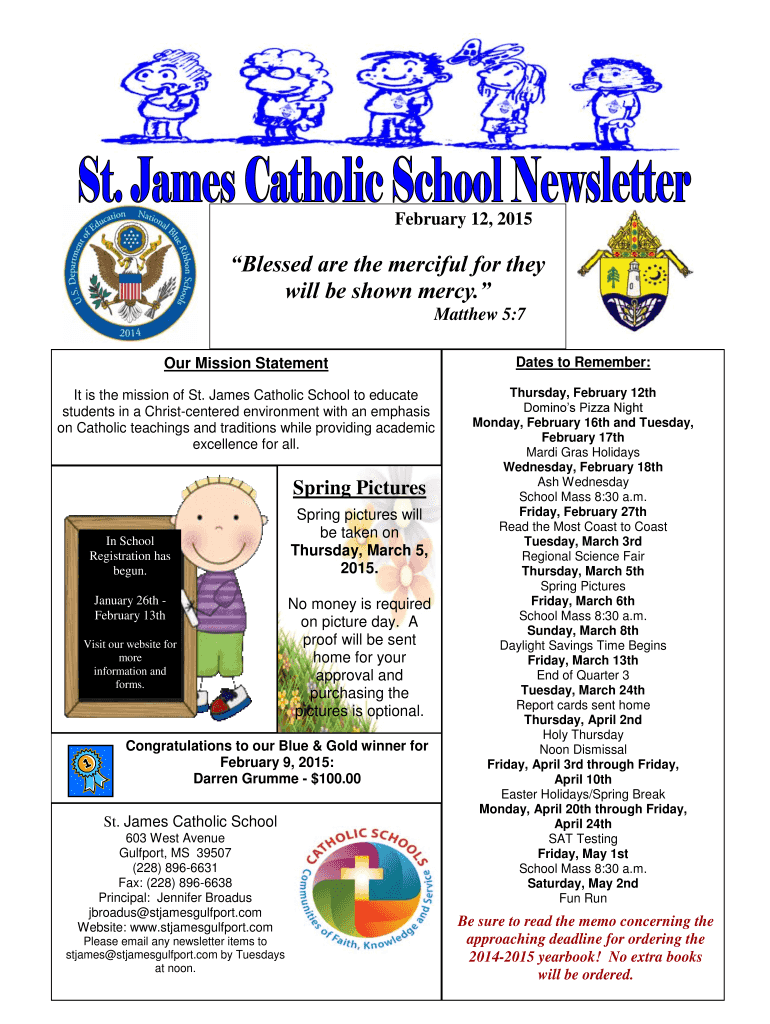 February 12, 2015, Blessed are the merciful for they will be shown mercy. Matthew 5:7 Our Mission Statement Dates to Remember: It is the mission of St. James Catholic School to educate students in