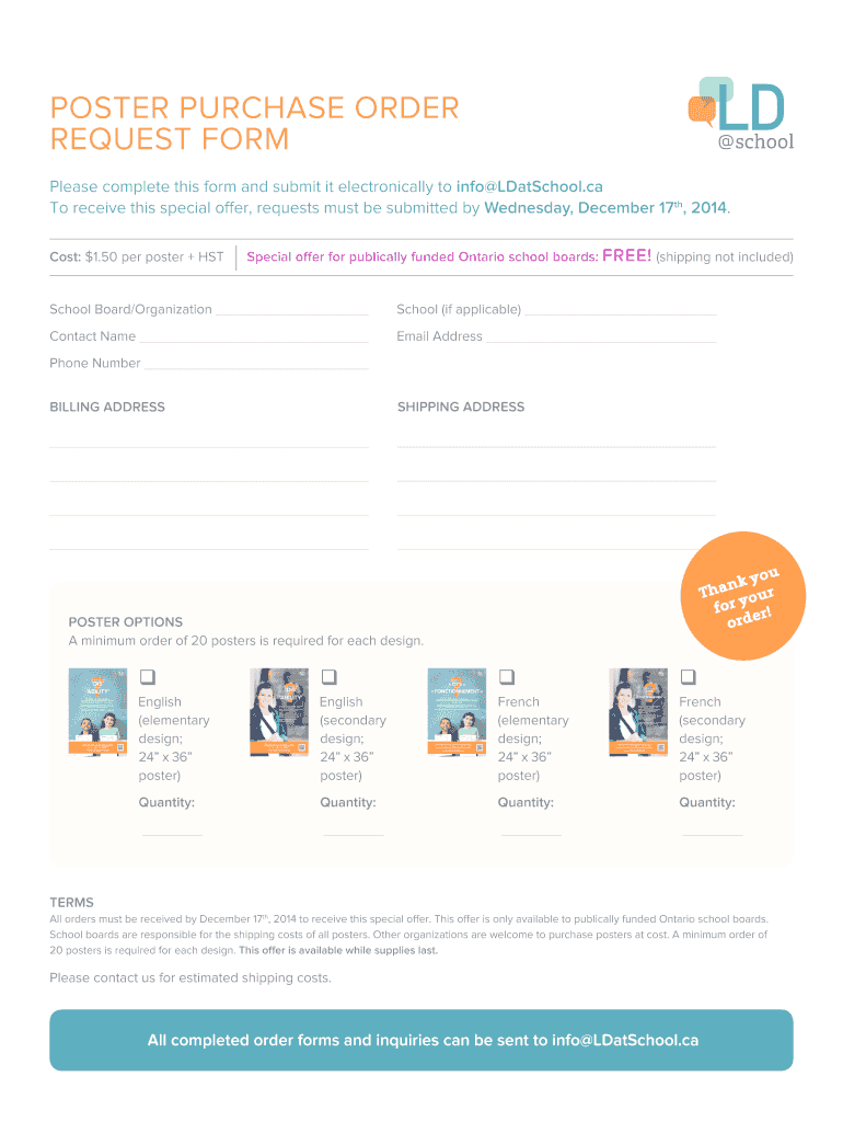 LD POSTER PURCHASE ORDER REQUEST FORM school Please complete this form and submit it electronically to info Playschool.ca To receive this special offer, requests must be submitted by Wednesday, December