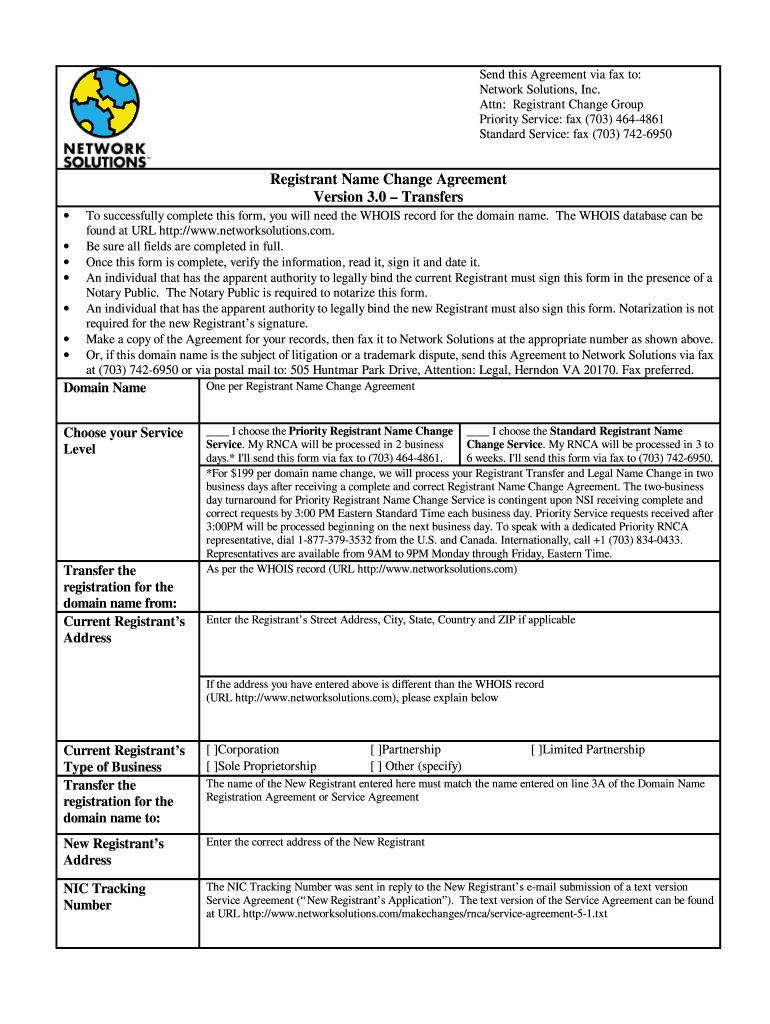 The Registrant Name Change Agreement is a business form used by current and new registrants to transfer domain name registration through Network Solutions.