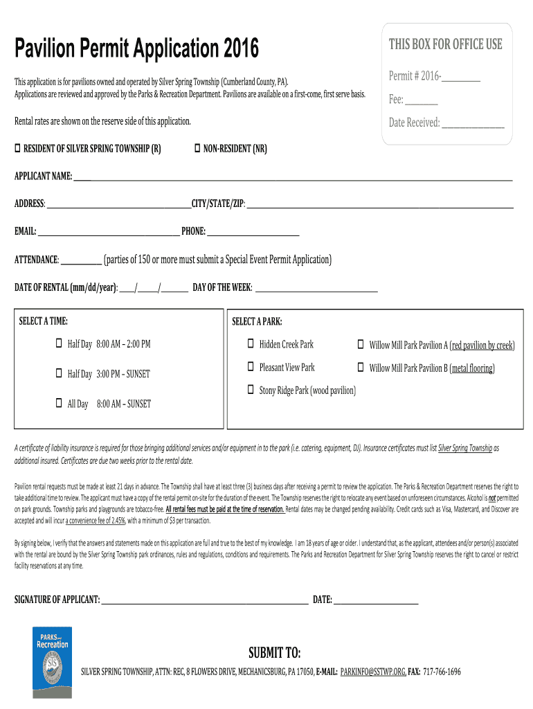 Pavilion Permit Application 2016 THIS BOX FOR OFFICE USE This application is for pavilions owned and operated by Silver Spring Township (Cumberland County, PA×. Applications are reviewed and approved