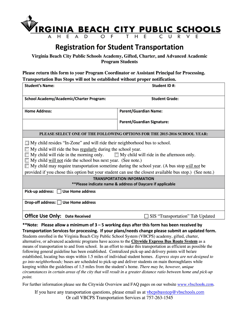 Access the Student Transportation Registration Form on the Virginia Beach City Public Schools website.