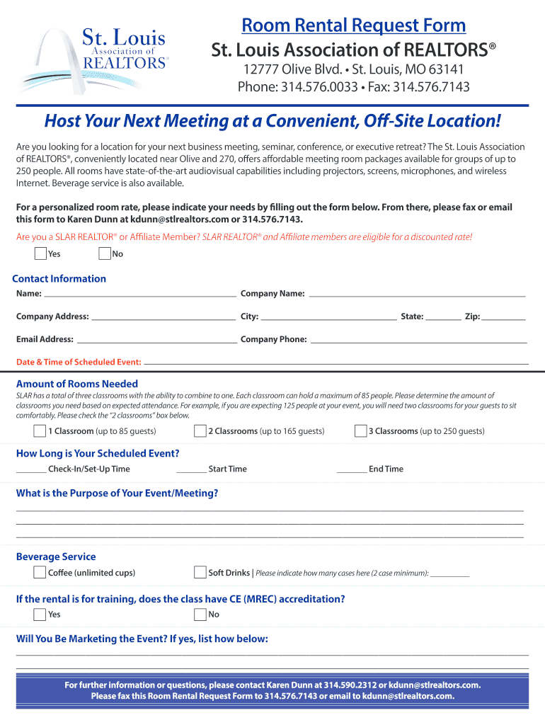 Room Rental Request Form St. Louis Association of REALTORS 12777 Olive Blvd. St. Louis, MO 63141 Phone: 314.576.0033 Fax: 314.576.7143 Host Your Next Meeting at a Convenient, Offsite Location! Are