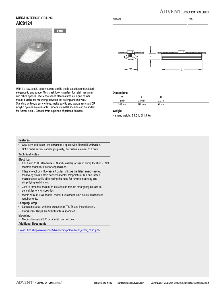 Get the free ADVENT SPECIFICATION SHEET MESA INTERIOR CEILING JOB NAME TYPE AIC8124 EMR With it '...
