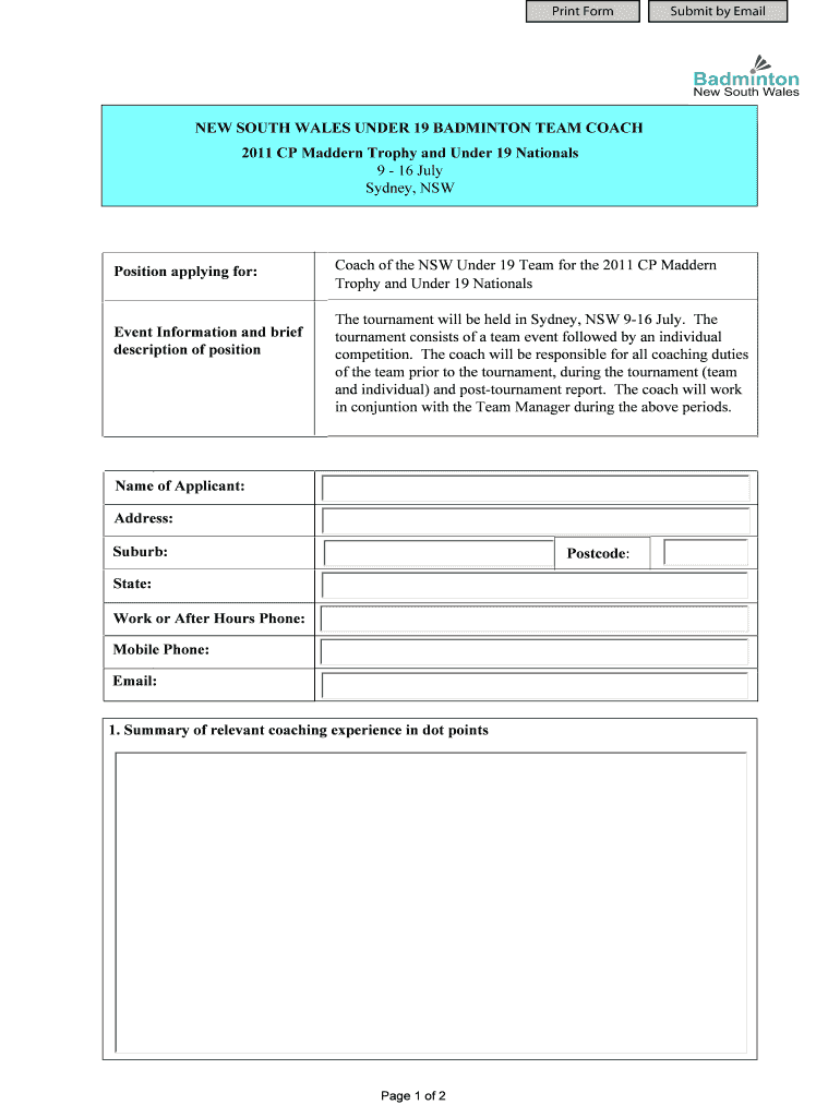 Print Form Submit by Email NEW SOUTH WALES UNDER 19 BADMINTON TEAM COACH 2011 CP Madden Trophy and Under 19 Nationals 9 16 July Sydney, NSW Position applying for: Event Information and brief description