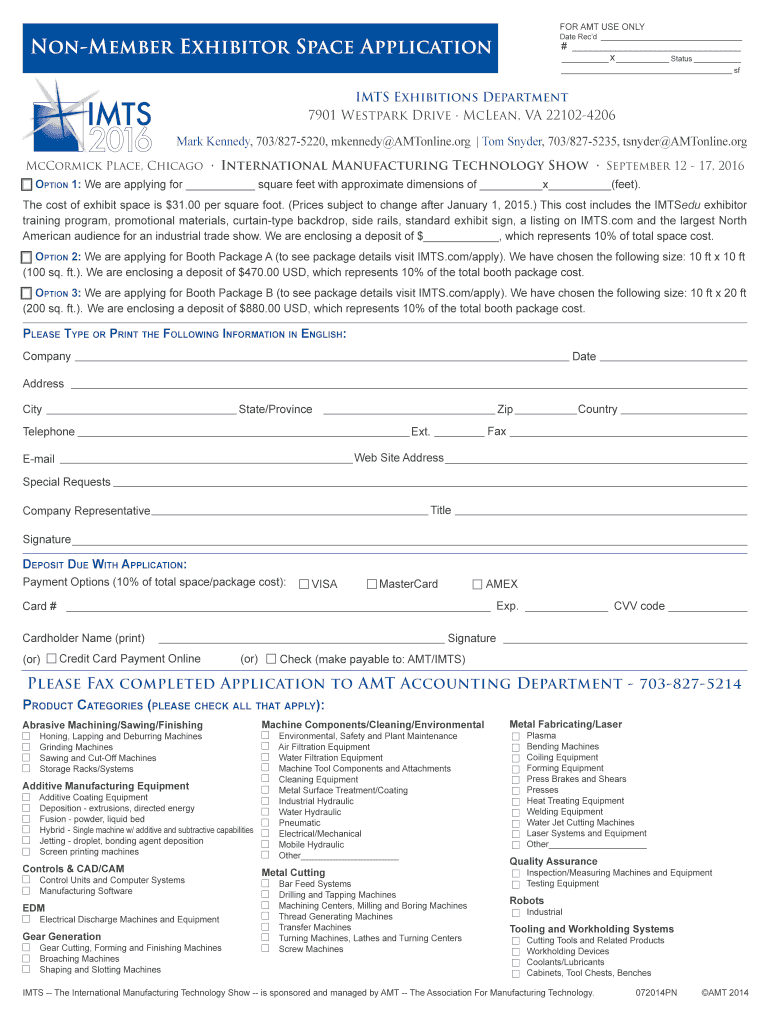 For AMT Use Only Date Recd Nonmember Exhibitor Space Application # x Status sf ITS Exhibitions Department 7901 West park Drive McLean, VA 221024206 Mark Kennedy, 703×8275220, Kennedy AMT online.org