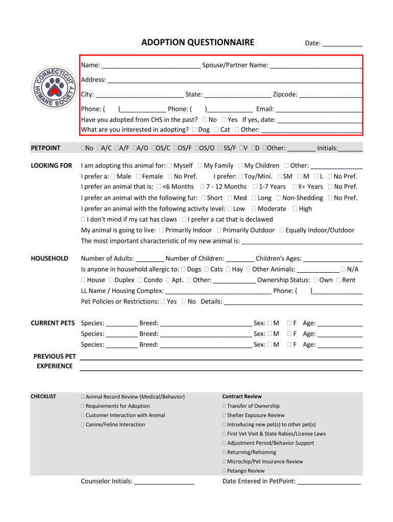 Adoption questionnaire - cthumaneorg is a form that potential adopters need to fill out when adopting a pet from the Connecticut Humane Society.