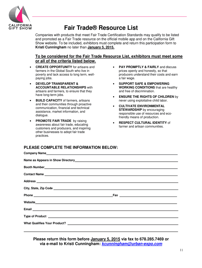 Fair Trade Resource List Companies with products that meet Fair Trade Certification Standards may qualify to be listed and promoted as a Fair Trade resource on the official mobile app and on the California