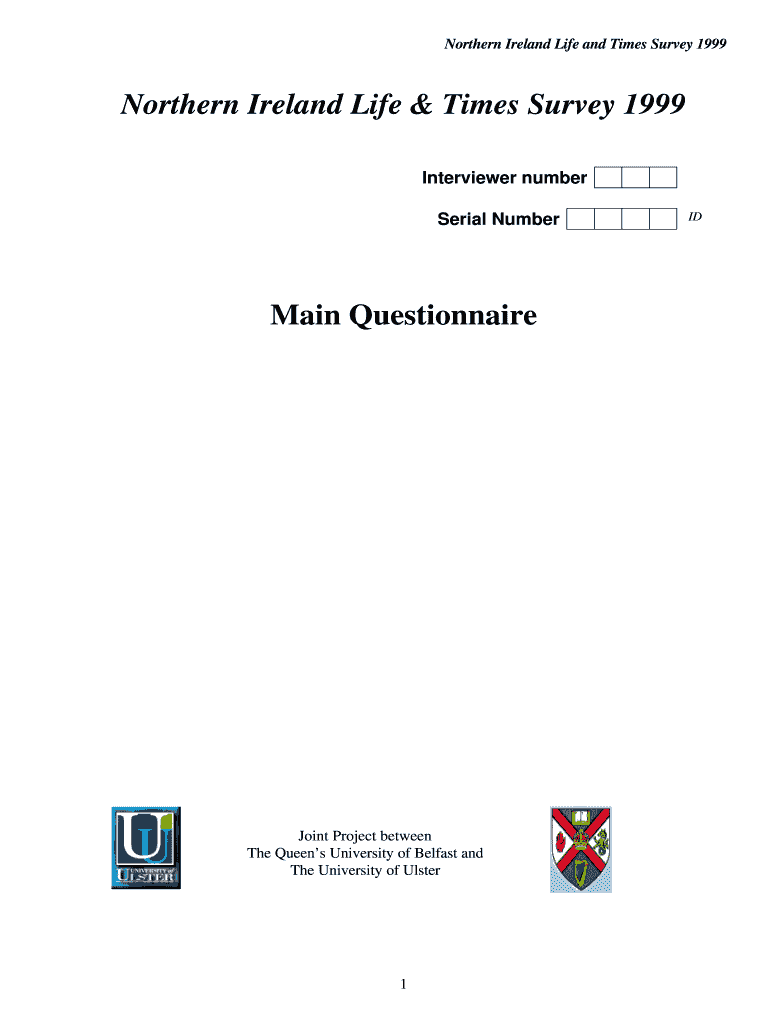 Northern Ireland Life and Times Survey 1999 Northern Ireland Life & Times Survey 1999 Interviewer number Serial Number Main Questionnaire Joint Project between The Queen's University of Belfast and