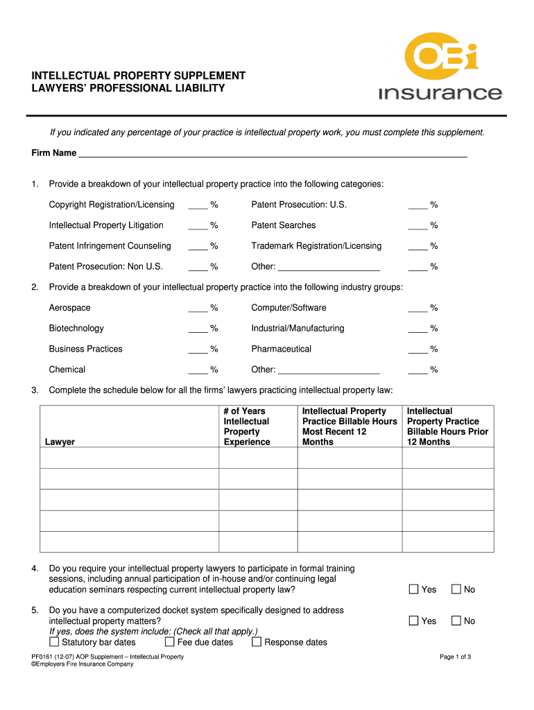 INTELLECTUAL PROPERTY SUPPLEMENT LAWYERS PROFESSIONAL LIABILITY If you indicated any percentage of your practice is intellectual property work, you must complete this supplement. Firm Name 1. Provide