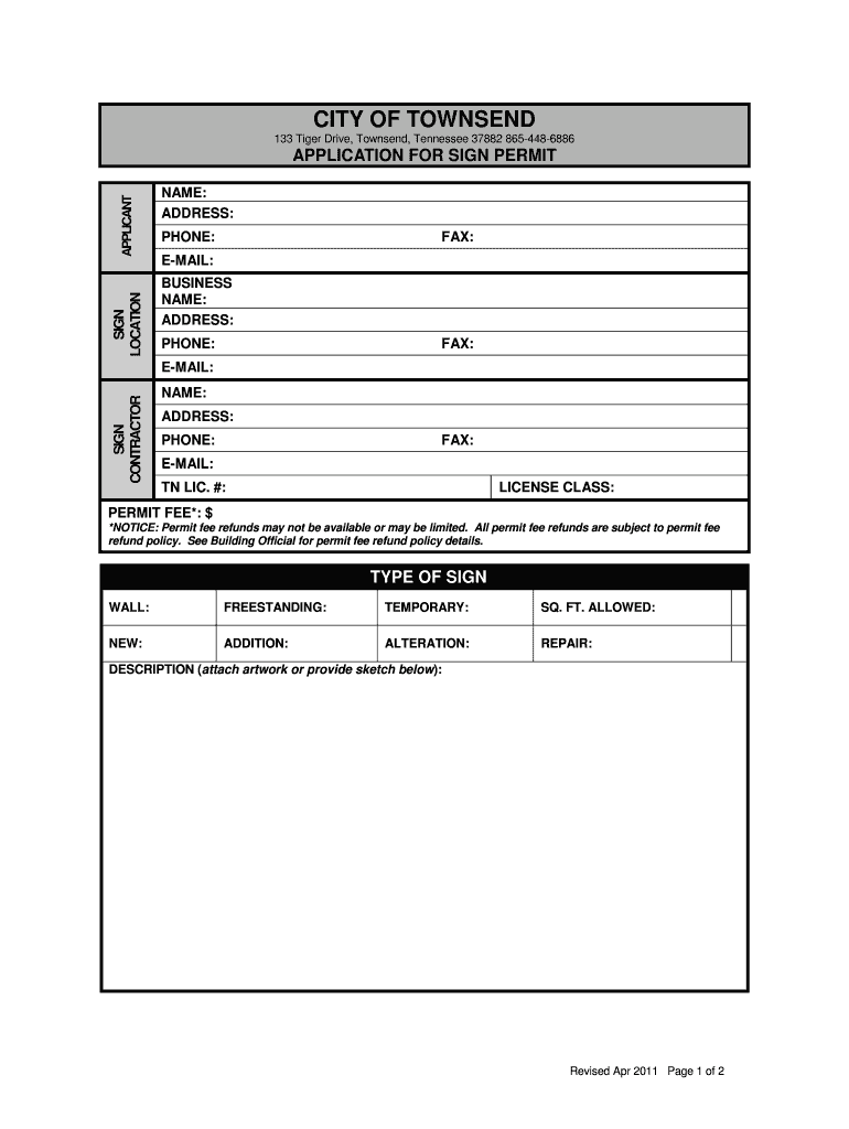 CITY OF TOWNSEND 133 Tiger Drive, Townsend, Tennessee 37882 8654486886 SIGN LOCATION APPLICANT APPLICATION FOR SIGN PERMIT NAME: ADDRESS: PHONE: FAX: EMAIL: BUSINESS NAME: ADDRESS: PHONE: FAX: SIGN