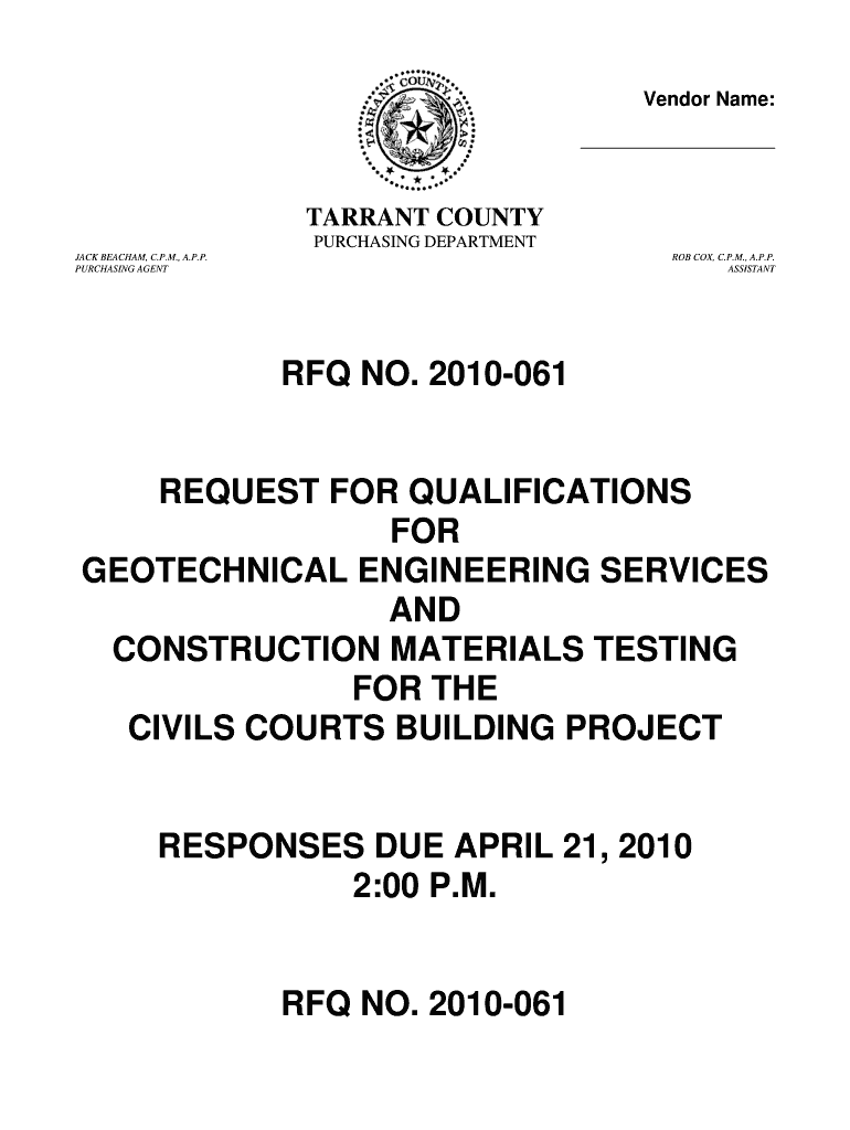 Tarrant County is soliciting qualifications for professional geotechnical engineering services and construction materials testing for the Civils Courts Building Project. The document outlines the