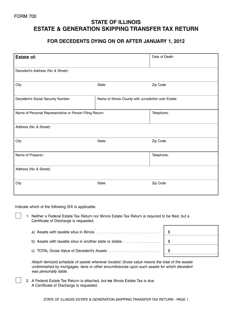 FORM 700 STATE OF ILLINOIS ESTATE & GENERATION SKIPPING TRANSFER TAX RETURN FOR DECEDENTS DYING ON OR AFTER JANUARY 1, 2012, Estate of: Estate of: Date of Death Decedents Address (No. & Street): City