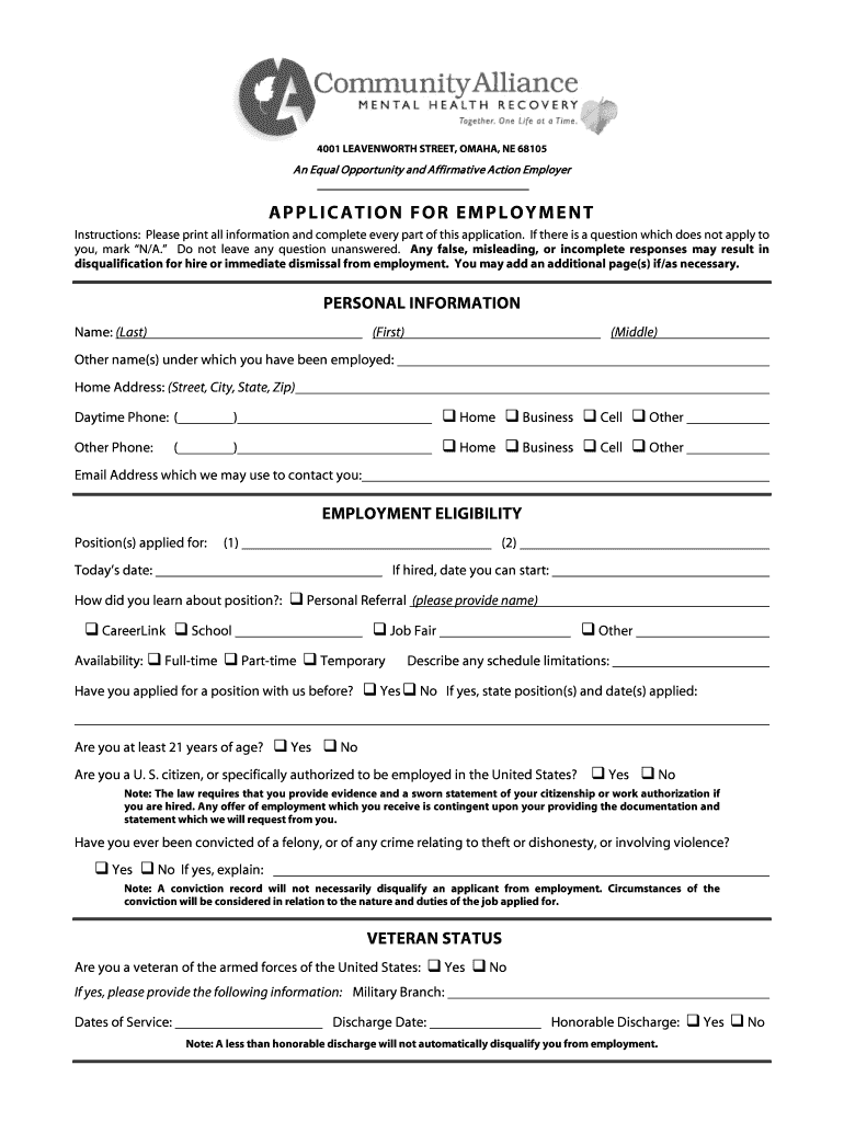 4001 LEAVENWORTH STREET, OMAHA, NE 68105 An Equal Opportunity and Affirmative Action Employer APPLICATION FOR EMPLOYMENT Instructions: Please print all information and complete every part of this