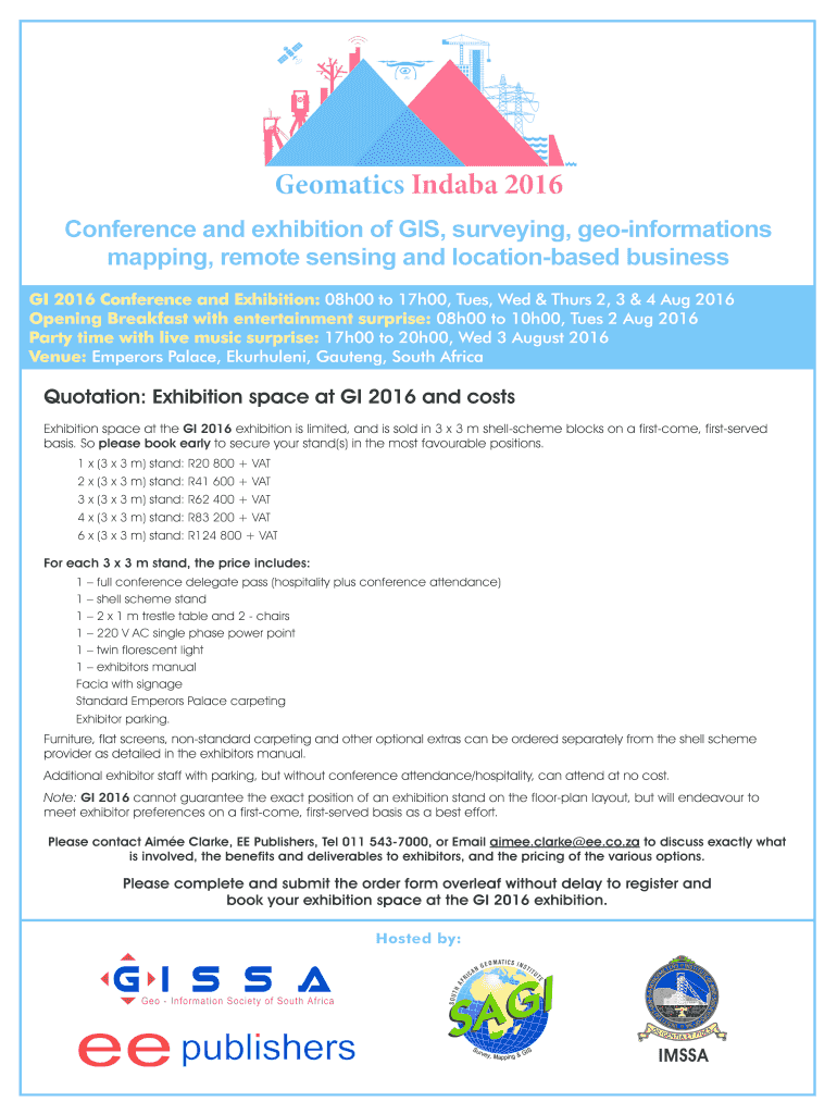 Conference and exhibition of GIS, surveying, conformations mapping, remote sensing and location based business GI 2016 Conference and Exhibition: 08h00 to 17h00, Tues, Wed & Thurs 2, 3 & 4 Aug 2016