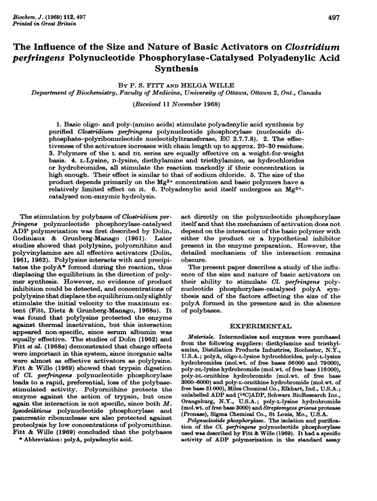 Biochem. J. (1969) 112, 497 Printed in Great Britain 497 The Influence of the Size and Nature of Basic Activators on Clostridium derringers Poly nucleotide Phosphorylase-Catalysed Polyphenolic Acid