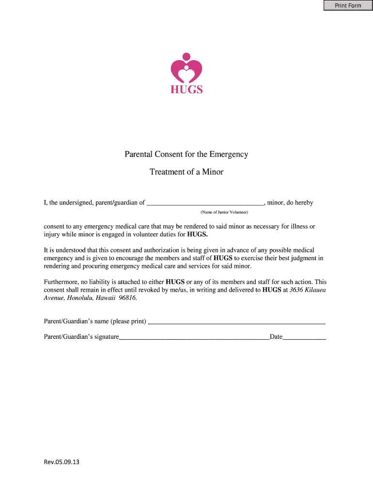 Print Form Parental Consent for the Emergency Treatment of a Minor I, the undersigned, parent×guardian of, minor, do hereby (Name of Junior Volunteer) consent to any emergency medical care that may