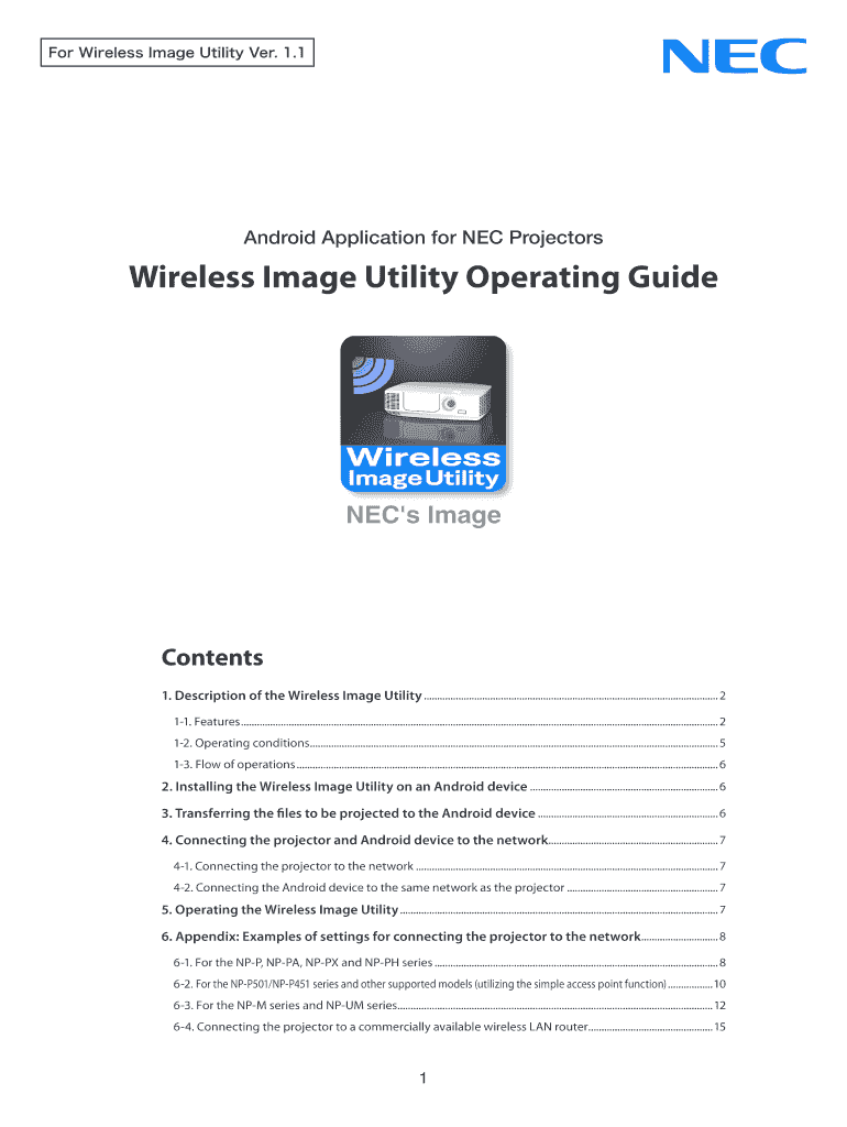 For Wireless Image Utility Very. 1.1Android Application for NEC ProjectorsWireless Image Utility Operating Guide NEC\'s Malcontents