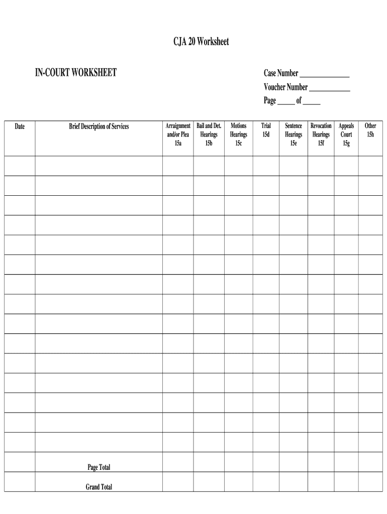 CJA 20 Worksheet COURT WORKSHEET Date Brief Description of Services Page Total Grand Total Case Number Voucher Number Page of Arraignment and×or Plea 15a Bail and DET. Hearings 15b Motions Hearings