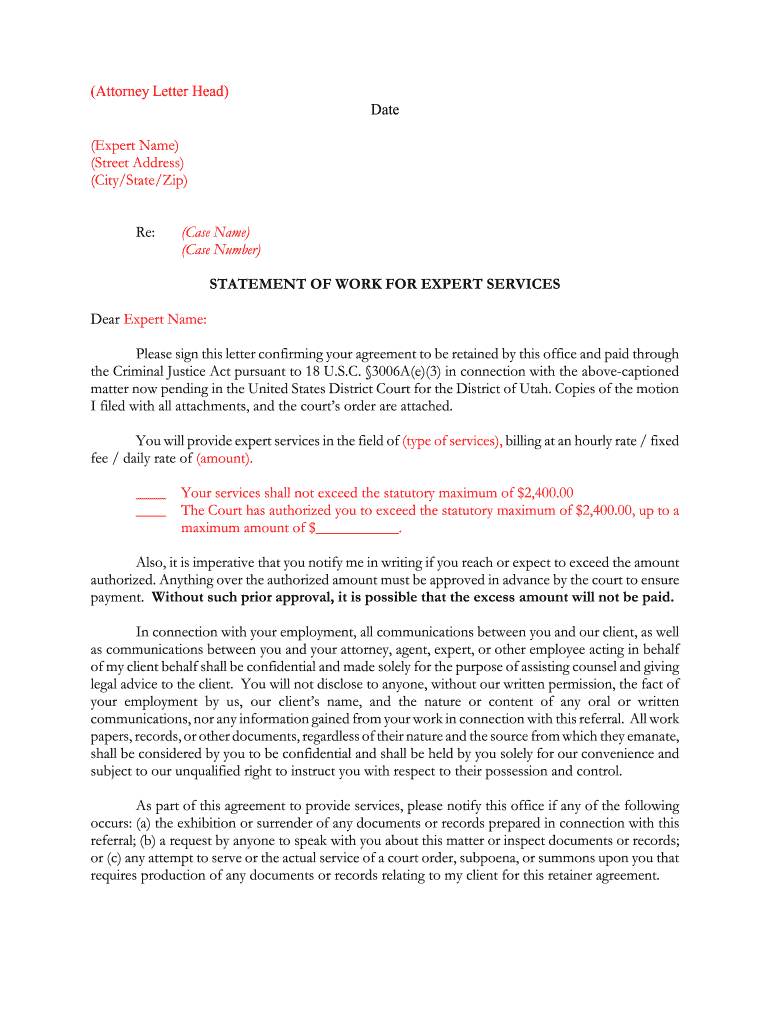 (Attorney Letter Head) Date (Expert Name) (Street Address) (City×State×Zip) Re: (Case Name) (Case Number) STATEMENT OF WORK FOR EXPERT SERVICES Dear Expert Name: Please sign this letter confirming