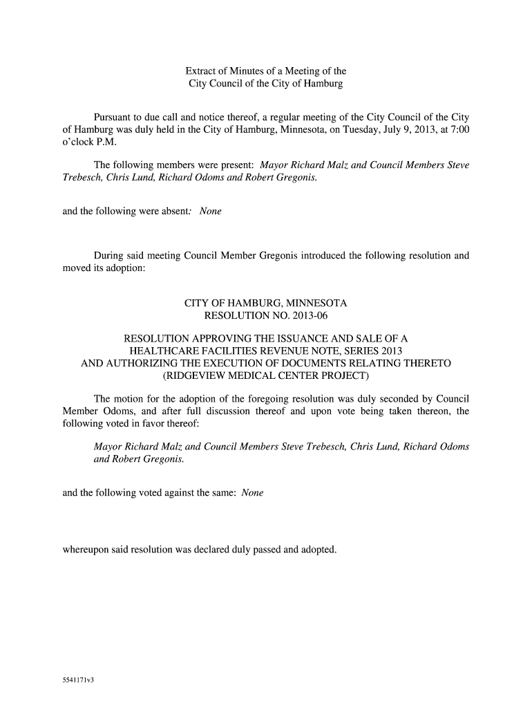 Extract of Minutes of a Meeting of the City Council of the City of Hamburg Pursuant to do call and notice thereof, a regular meeting of the City Council of the City of Hamburg was duly held in the