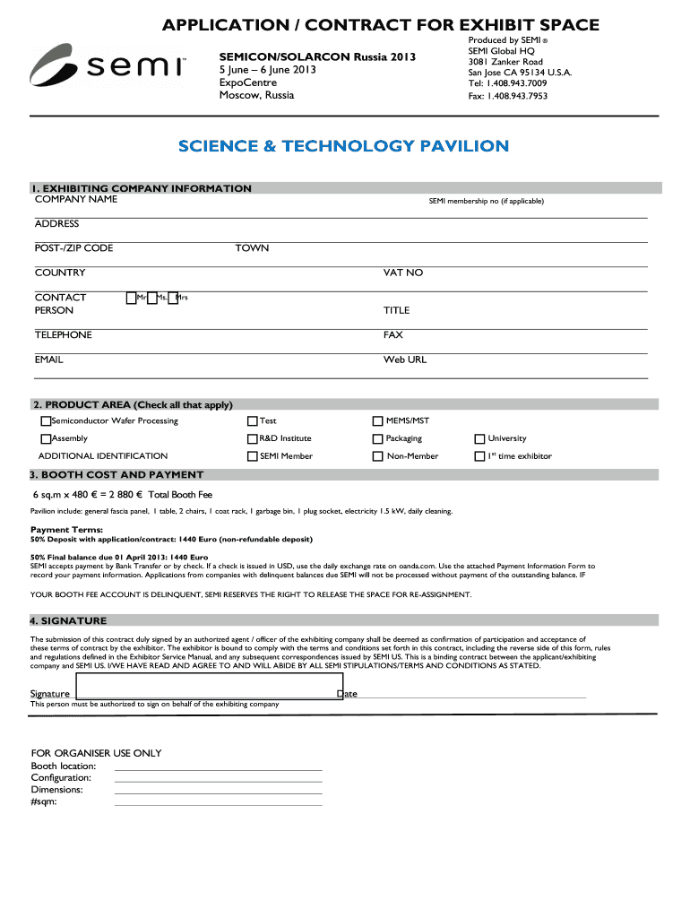 APPLICATION / CONTRACT FOR EXHIBIT SPACE Produced by SEMI Global HQ 3081 Banker Road San Jose CA 95134 U.S.A. Tel: 1.408.943.7009 Fax: 1.408.943.7953 SEMICON×SOLAR CON Russia 2013 5 June 6 June 2013