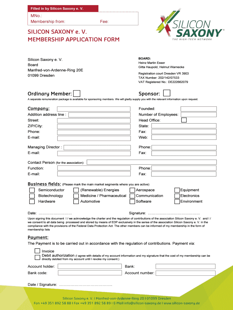 Filled in by Silicon Saxony e. V. No.: Membership from: Fee: SILICON SAXONY e. V. MEMBERSHIP APPLICATION FORM Silicon Saxony e. V. Board ManfredvonArdenneRing 20E 01099 Dresden BOARD: Heinz Martin