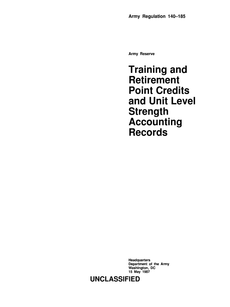 Army Regulation 140185 Army Reserve Training and Retirement Point Credits and Unit Level Strength Accounting Records Headquarters Department of the Army Washington, DC 15 May 1987 UNCLASSIFIED SUMMARY