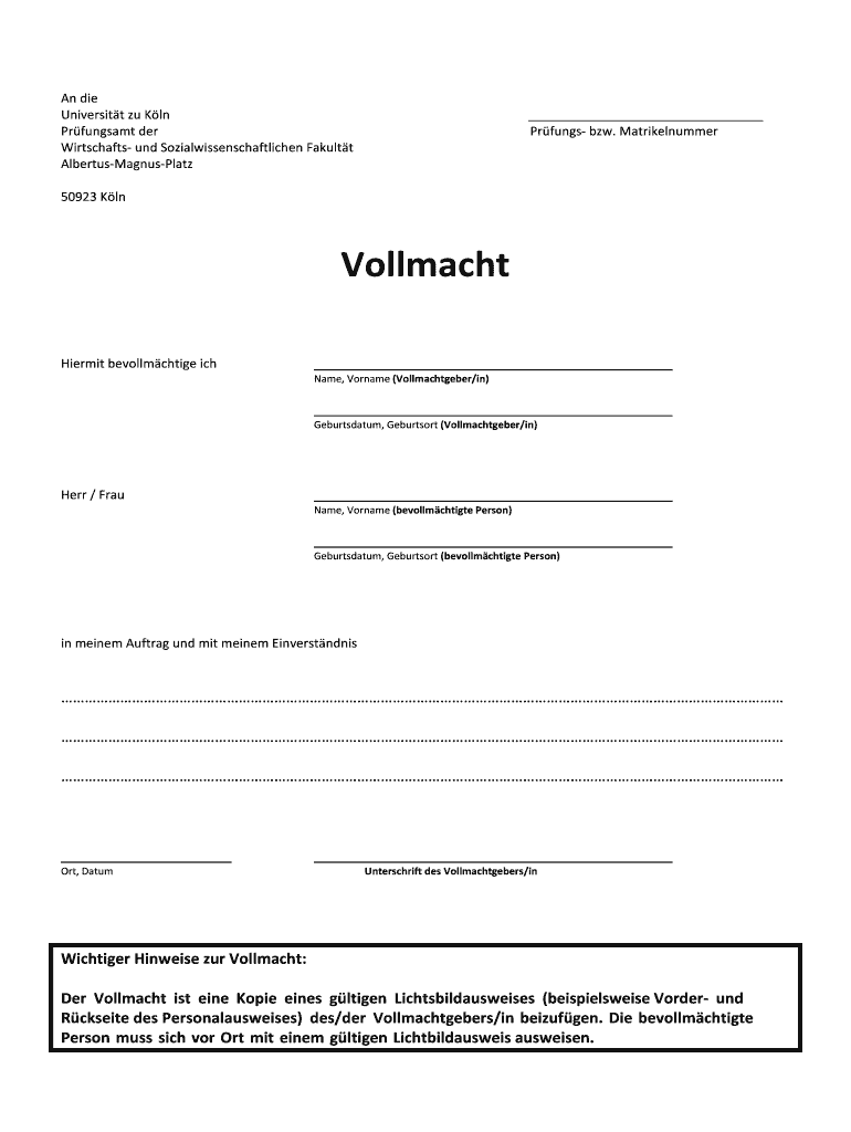 A die University EU Kiln Prfungsamt her Airshafts UND Sozialwissenschaftlichen Faculty AlbertusMagnusPlatz Prongs BMW. Matrikelnummer 50923 Kiln Villach Hermit bevollmchtige ICH Name, Surname (Vollmachtgeber×in)
