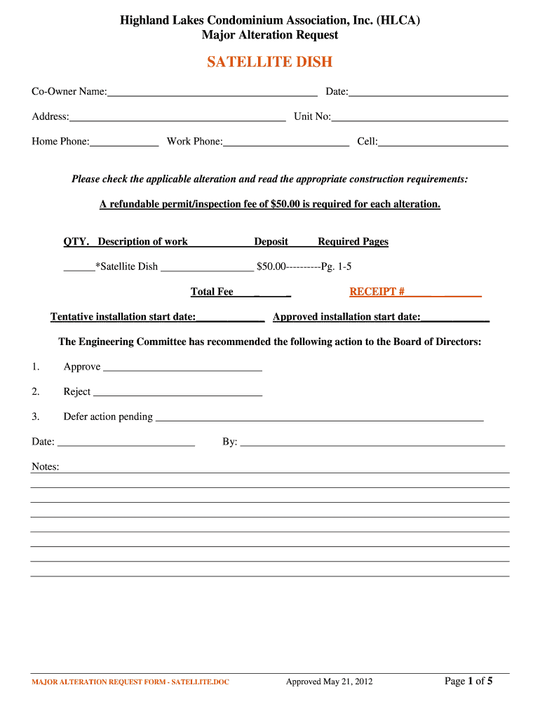 Highland Lakes Condominium Association, Inc. (HCA) Major Alteration Request SATELLITE DISH Corner Name: Date: Address: Unit No: Home Phone: Work Phone: Cell: Please check the applicable alteration