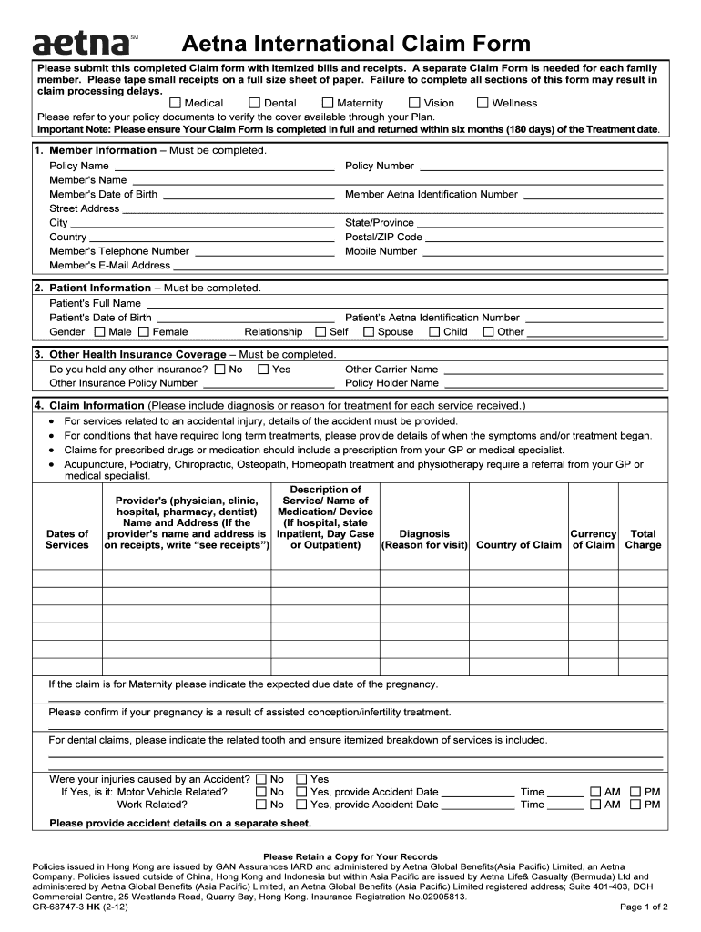 Please submit this completed Claim form with itemized bills and receipts. ... administered by Aetna Global Benefits (Asia Pacific) Limited, an Aetna Global Benefits (Asia Pacific) ... Use the payment