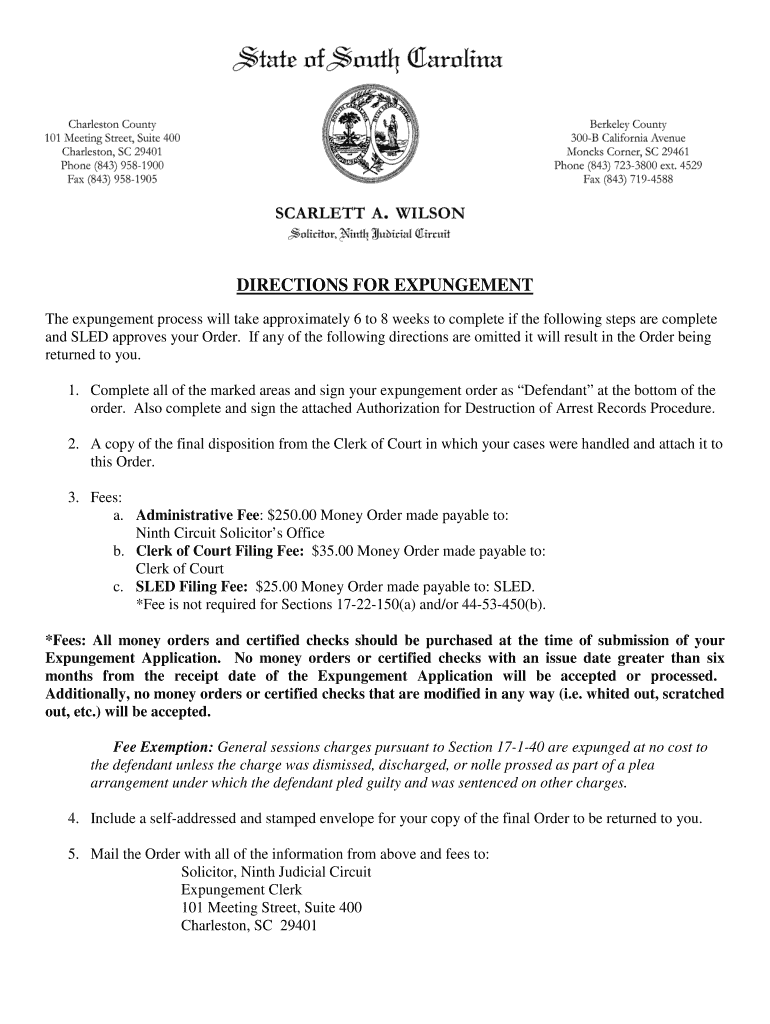 Get the free DIRECTIONS FOR EXPUNGEMENT - scsolicitor9org
