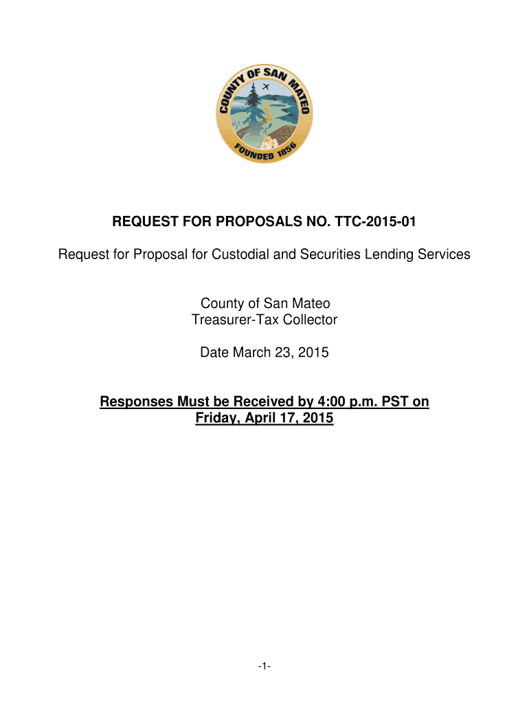 REQUEST FOR PROPOSALS NO. TTC201501 Request for Proposal for Custodial and Securities Lending Services County of San Mateo Treasurer Collector Date March 23, 2015, Responses Must be Received by 4:00