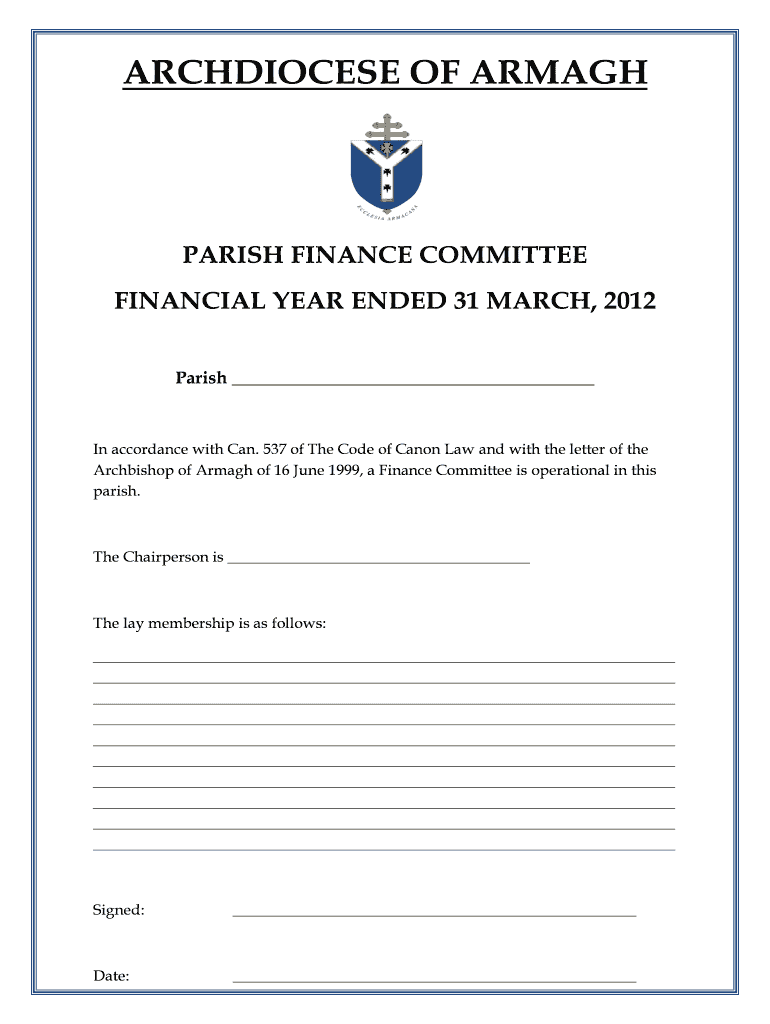 ARCHDIOCESE OF ARM AGH PARISH FINANCE COMMITTEE FINANCIAL YEAR ENDED 31 MARCH 2012 Parish In accordance with Can. 537 of The Code of Canon Law and with the letter of the Archbishop of Armand of 16