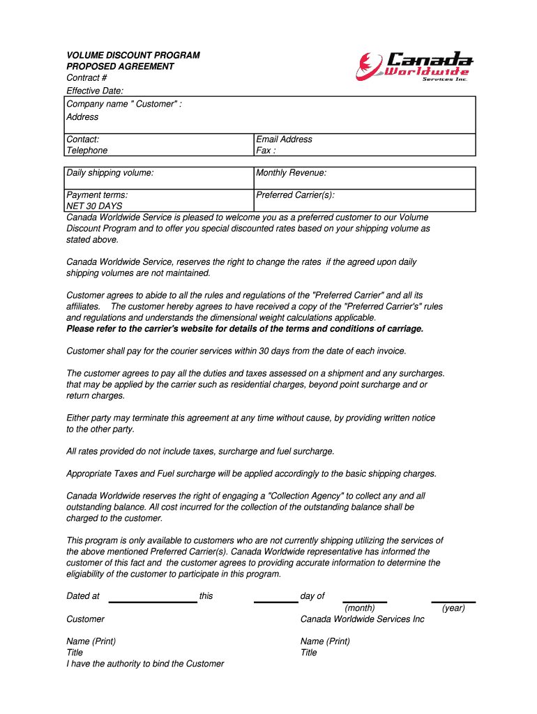 VOLUME DISCOUNT PROGRAM PROPOSED AGREEMENT Contract # Effective Date: Company name Customer : Address Contact: Telephone: Email Address Fax : Daily shipping volume: Monthly Revenue: Payment terms: