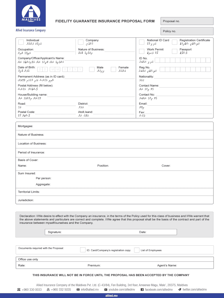 FIDELITY GUARANTEE INSURANCE PROPOSAL FORM Proposal no. Policy no. Individual Company National ID Card Registration Certificate cnudurwf wlcaimwa inufcnuk CDK.ID. Iowa cTekifcTes IrcTcsijwr Nature