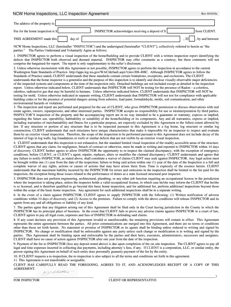 NCW Home Inspections, LLC Inspection Agreement Rev 041010c The address of the property is:. Fee for the home inspection is $ THIS AGREEMENT made this. INSPECTOR acknowledges receiving a deposit of