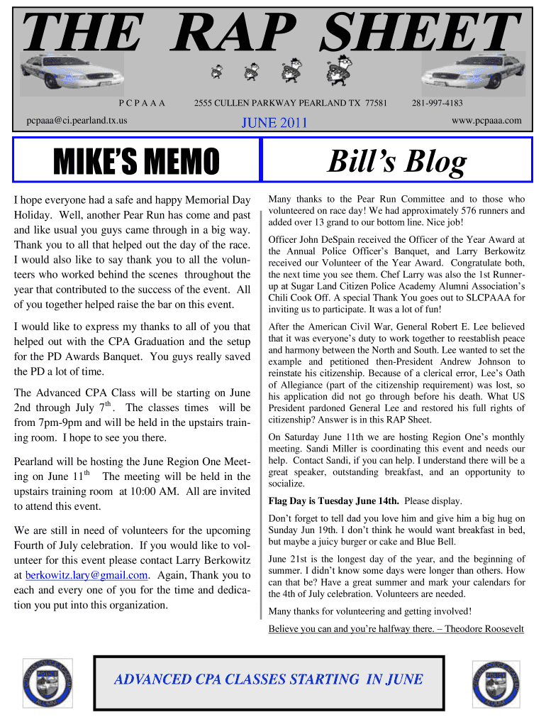 PCP AAA 2555 CULLEN PARKWAY PEARLAND TX 77581 papaya CI. Pearland.TX.us 2819974183 www.pcpaaa.com JUNE 2011 MIKES MEMO Bills Blog I hope everyone had a safe and happy Memorial Day Holiday. Well, another