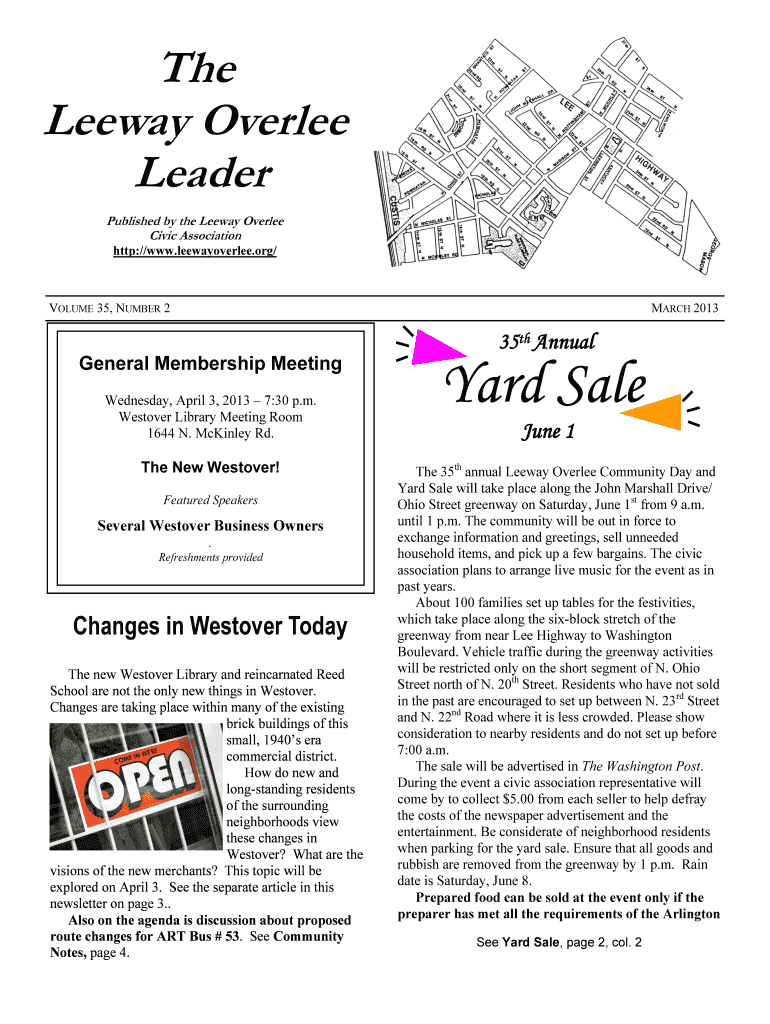 The Leeway Oversee Leader Published by the Leeway Oversee Civic Association HTTP://www.leewayoverlee.org/ VOLUME 35, NUMBER 2 MARCH 2013 General Membership Meeting Wednesday, April 3, 2013 7:30 p.m.