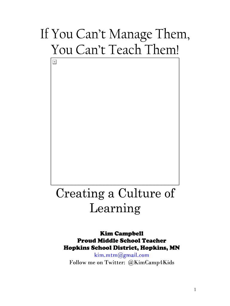 If You Can't Manage Them, You Can't Teach Them! Creating a Culture of Learning Kim Campbell Proud Middle School Teacher Hopkins School District, Hopkins, MN Kim. Mm, gmail.com Follow me on Twitter: